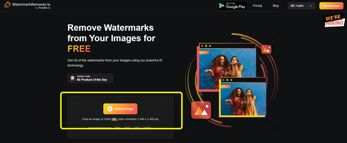 Paso 1: Ve a la Sitio web de Watermark Remover.io. Luego haga clic en el Cargar imagen botón para agregar su imagen PMG con una marca de agua. Puede pegar el enlace de la foto haciendo clic en el botón URL.