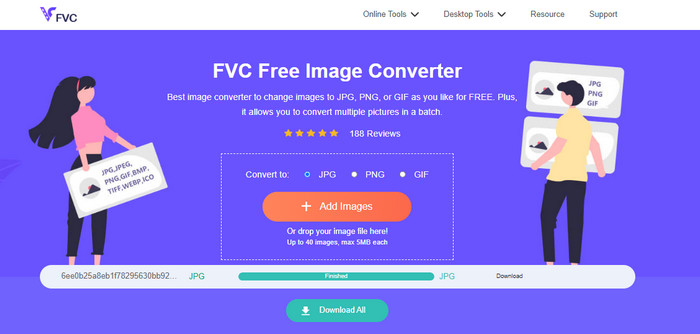 از آنجایی که فرمت فایل JPG فایل های کوچکتری نسبت به فرمت های دیگر مانند PNG دارد، می توانید تصاویر را به فرمت JPG تبدیل کنید. برای تبدیل تصویر، استفاده کنید مبدل تصویر رایگان FVC. فقط فرمت مورد نظر خود را انتخاب کنید که فرمت JPG است. عکسی را که می خواهید تبدیل کنید آپلود کنید و روی دکمه دانلود کلیک کنید. به این ترتیب می توانید تصاویر را با حجم کمتری به JPG تبدیل کنید.