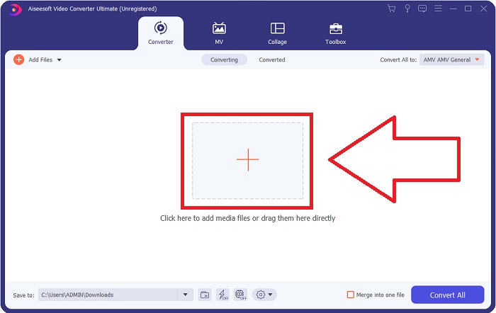 Step 2: Then, you will see a window pop up on your screen. The software will display the Converter function. To import a file from your computer, click the + button in the middle, or you can simply drag any DV video format file to the center.