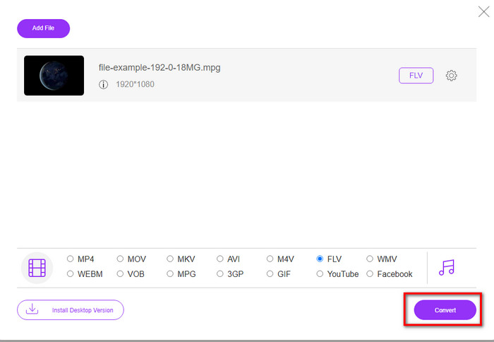If you want to convert MPEG to FLV for free, use the FVC Free Video Converter Online. This online tool is available in all search engines to help you with your converting problem. Although the online converter is free, the functions and features here are not as broad as the FVC Video Converter Ultimate. But you can perform converting .mpeg or .mpg files here easier and better than the FFmpeg. Another good thing about this web tool is that you wouldn't need to download it on your desktop. You save some space on your storage if you use this tool. Want to know how to use this tool? If so, let's proceed with the steps.