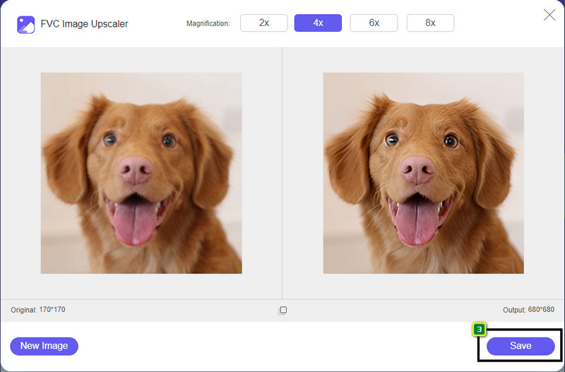 Step 4. After selecting the magnification you want to apply to your image, press Save to download the photo on your local drive directly. As easy as that, you have the 1440p images on your local drive and can now use them fully.