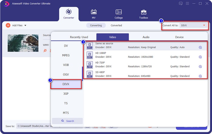 ステップ3。 最後に、をクリックします 落ちる ボタンをクリックして、出力形式として Divx を選択し、 変換 ボタンをクリックして、WMV ファイルを DivX に変換します。